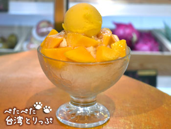 マンゴーアイスクリームを縦に2つ重ねた「マンゴーかき氷」(ダブル)260NT$(2019年5月時点)もあります。