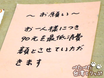 2019年5月に行くと「1人につき一品90NT$以上を注文しなければならない」という注文時のルールが出来ていました。