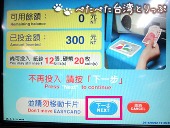 紙幣や硬貨でチャージしたい金額を100NT$単位で入れます。(券売機は、硬貨も使えます。)